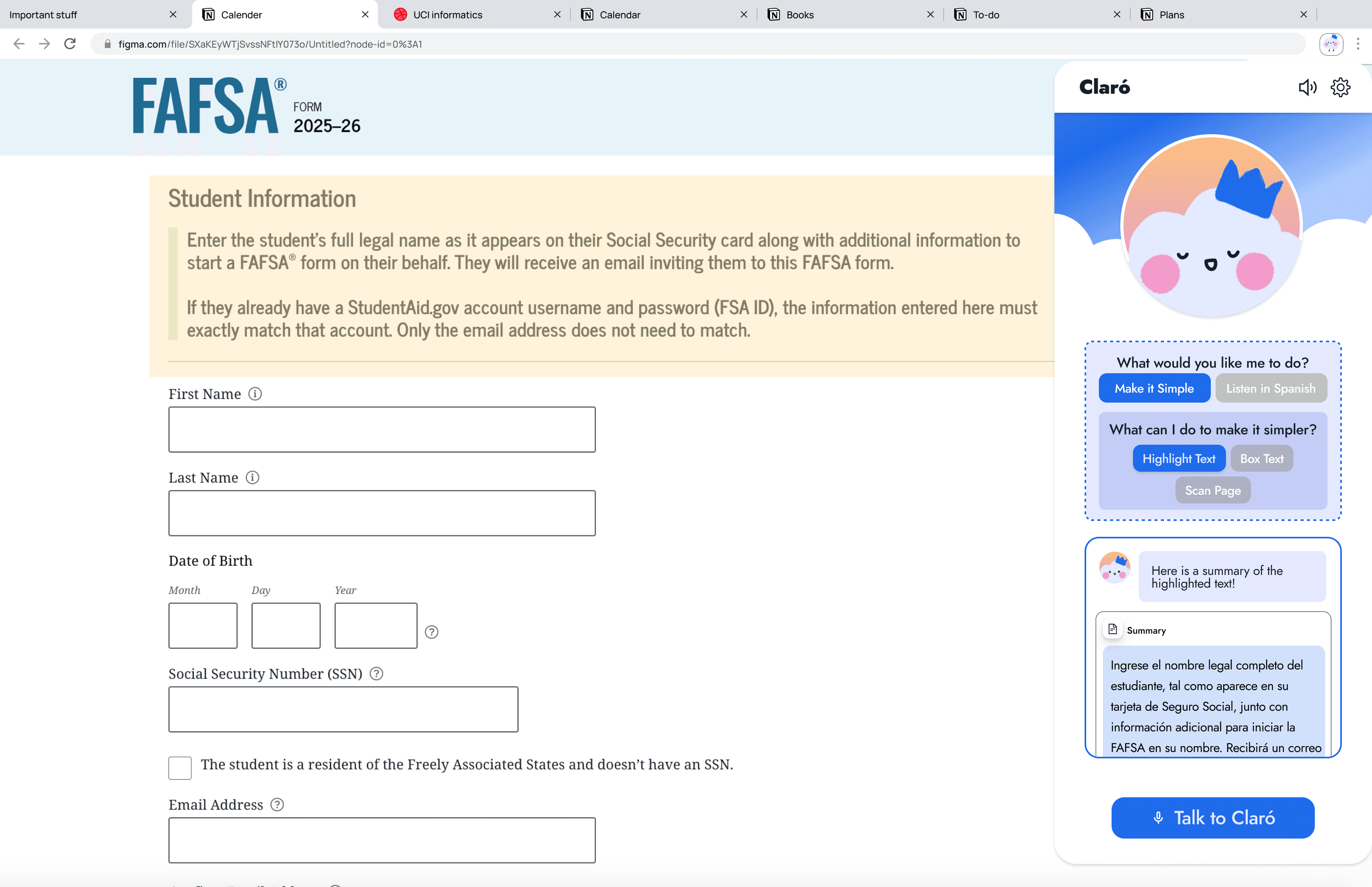 Our final prototype showcases Claró’s core features in a polished, interactive format. Users can experience simplified translations, voice narration, tap-and-ask support, and contextual suggestions, all designed to make navigating emails, forms, and official documents intuitive and stress-free for immigrant parents.